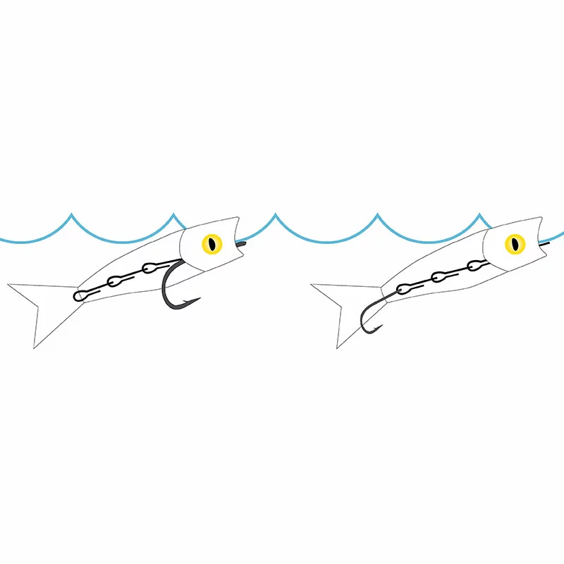 The Howitzer imitates the head of a small minnow (or baitfish) that is splashing and sipping at the surface of the water. It’s designed with a deep recess at the back of the head so that an articulated body and tail of a minnow can be embedded seamlessly into the back of the head. As a result, the body of the minnow hangs down in the water (roughly at a 45-degree angle) and moves enticingly in a position that can be seen by predatory fish from a long distance and offers them an irresistible profile and an easy opportunity for a meal!